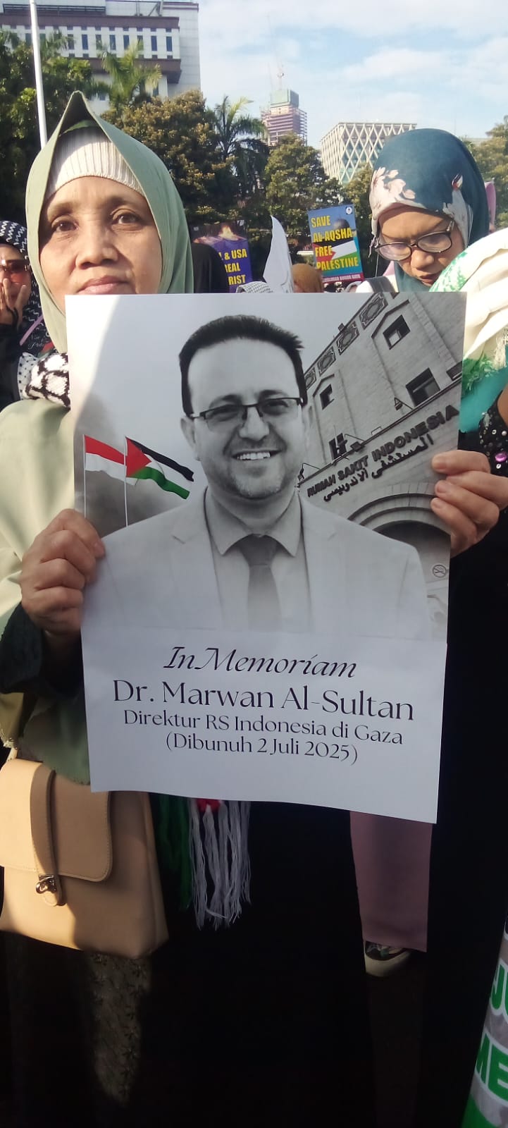Aksi damai diawali dengan pernyataan bela sungkawa yang mendalam atas wafatnya Direktur RS Indonesia di Gaza Marwan Al Sultan dan keluarganya yang menjadi korban atas kebrutalan Israel, 2 Juli lalu.